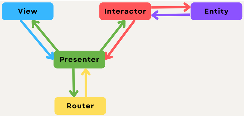 Router:Dĩ nhiên nghe tên chúng ta cũng hình dung được nó có trách nhiệm gì rồi nhỉ. Nó sẽ nhận trách nhiệm di chuyển giữa các màn hình trong ứng dụng iOS của chúng ta (push, pop, presenter, dismiss,...).